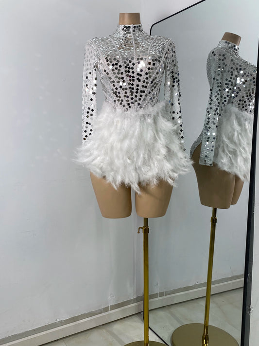 Luxury Sequined Mirror Beading Bodysuit for Women Sexy Long Sleeve Feather White Performance Dance Stage Costume Clubwear