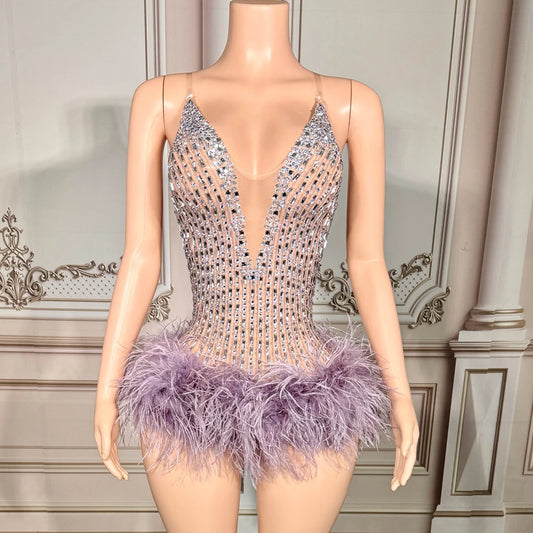 Luxurious Rhinestones Ostrich Feathers Bodysuit Women Sexy Mesh Transparent Evening Celebrate Birthday Dress Performance Costume