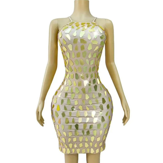 Sexy Shiny Gold Mirrors Trim Fit Suspenders Dress Women Daily Birthday Celebrate Cocktail Party Club Costume Show Stage Outfit