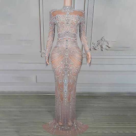 Elegant Crystals Pearls Long Dress Women Sexy SeeThrough Mesh Evening Dress Birthday Celebrate Wedding Photoshoot Stage Wear