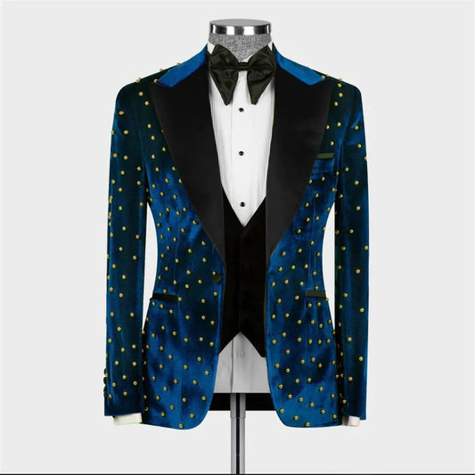 Trajes de terciopelo para hombre con perlas doradas hechas a mano, esmoquin de novio para boda, solapa de pico negra, conjunto de 3 piezas de blazer formal para graduación.