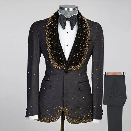 Conjunto de 3 piezas de esmoquin con adornos de joyería de cuentas de lujo para hombre, traje con lentejuelas brillantes y solapa para boda, novio y fiesta.