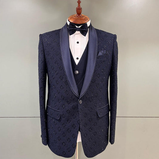 Realza tu atuendo formal con el traje de novio Jacquard con perlas y cuentas negras,...