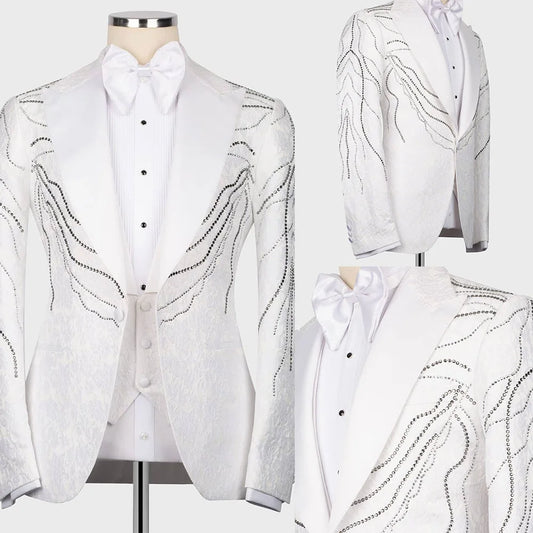 Fashion Men Suit Tailored Blazer 3 Pieces Set Coat Peaked Lapel Rhinestone Jacquard Formal Occasion Customized Jacket Vest Pants