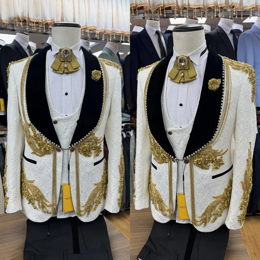 Elegant Men Suits Tailor-Made 3 Pieces Shawl Lapel Jacket Beading Blazer Jacquard One Button Groom Customized Coat Vest Pants