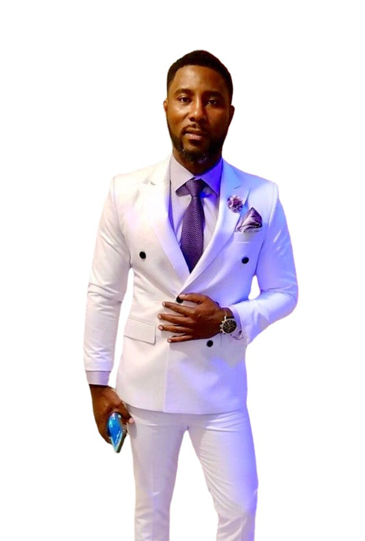 Esmoquin de novio blanco de doble botonadura con abertura lateral y solapa de pico (chaqueta, pantalón y corbata)