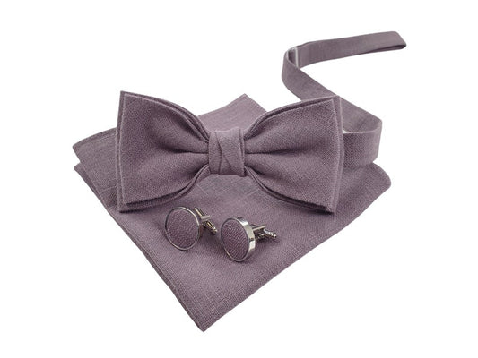Pajarita morado polvoriento / Gemelos morado polvoriento / Pañuelo de bolsillo morado polvoriento / Tirantes morado polvoriento / Pajarita de lino / Tirantes morado polvoriento