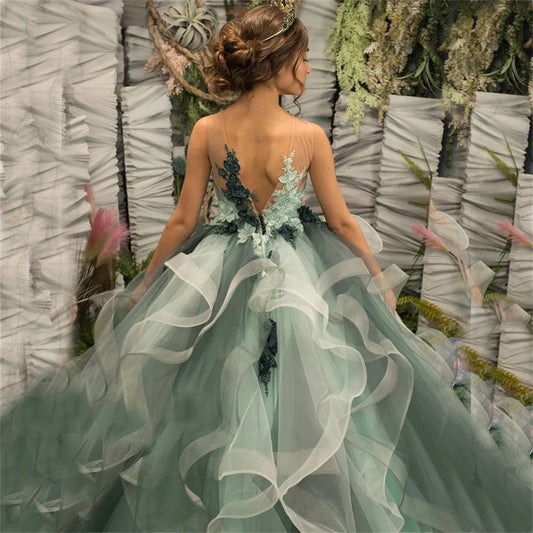 Elegante vestido de fiesta verde sin espalda con apliques de encaje y falda de tul