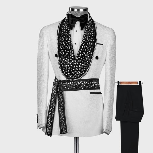 Elegante traje de esmoquin con diamantes para hombre, ideal para bodas y eventos formales: elegante blazer blanco y negro a medida con pantalón a juego.