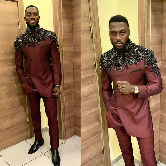Elegante traje de esmoquin para hombre con detalles de cristales y cuentas, corte entallado, diseño de un botón para bodas y eventos formales.