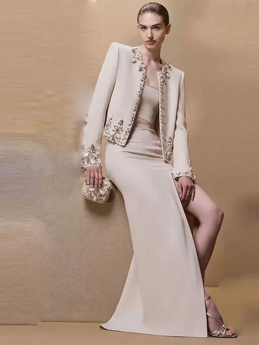 Conjunto de traje de diseñador de moda para mujer, con perlas, diamantes y cuentas de imitación, chaqueta con ribete de cuentas y pantalón con abertura acampanada.