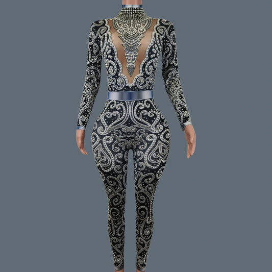 Fashion Sparkly Rhinestones Pearls Jumpsuit Women Stretchy Nightclub Party Singer Dancer Performance Costume Stage Wear