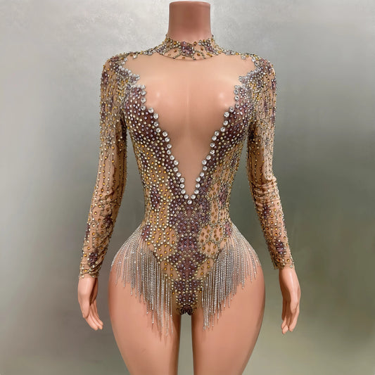 Body sexy con borlas y cadena de diamantes de colores brillantes para fiestas nocturnas, actuaciones, bares, discotecas, cantantes y bailarinas.