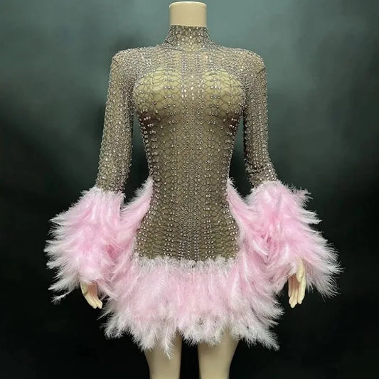 Minivestido transparente con plumas rosas y diamantes de imitación brillantes, sexy, para fiestas nocturnas, actuaciones, bares, discotecas y escenarios.