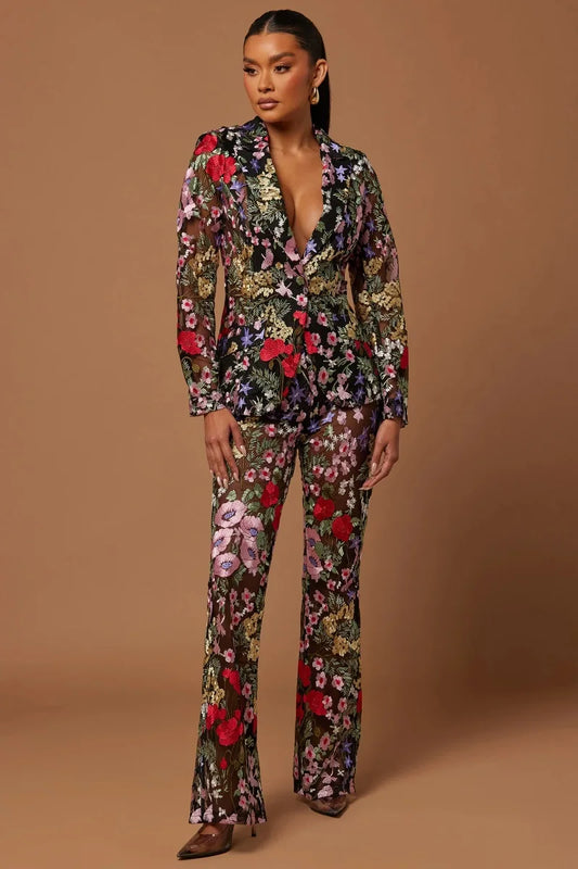 Conjunto de traje y pantalón de 2 piezas para mujer, con diseño de flores, para boda, chaqueta sexy con cuello en V, abrigo y pantalón, vestido formal para invitada de graduación, hecho a medida.