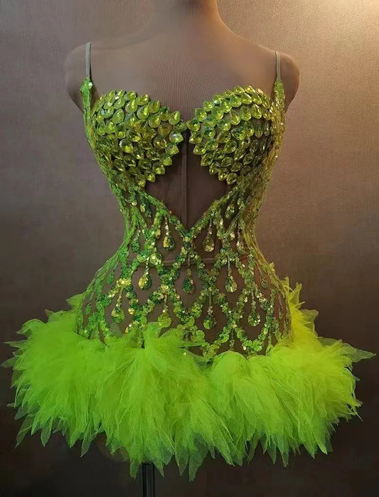 Fluorescent Yellow Rhinstone Mesh Tube Top Evening Dress Sing Gala Elegant Women Party Birthday Special Ocassion Sexy Costume