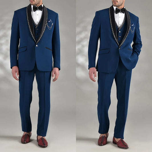 Trajes de boda azules para caballero con cuello de cuentas, a medida, para novios, 3 piezas, para ocasiones formales, fiestas, cantantes.