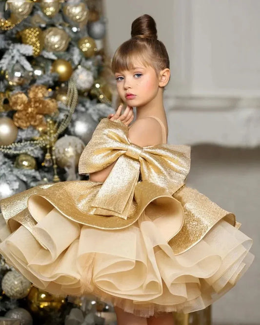 Vestido de tul con volantes color champán dorado para niñas, con lazo grande y diseño sin mangas
