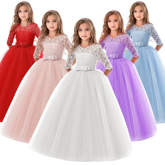 Vestido de princesa con lazo, largo hasta el suelo, de tul y encaje para niñas, ideal para ocasiones especiales.