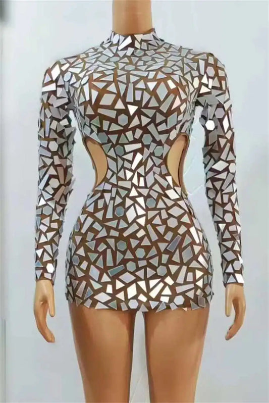 Mirror Women Short Dress Silver Sparkly Singer Performance Costume Drag Queen Outfit Birthday Stage Celebrate S-XL