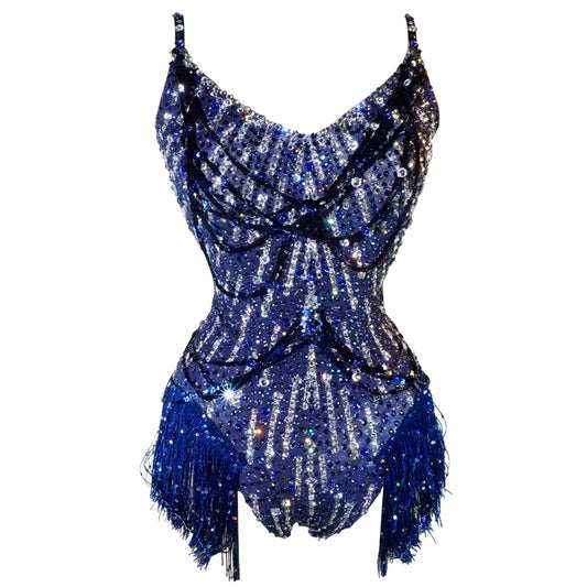 Nuevos disfraces de cantante de música, mono con borlas y brillantes diamantes de imitación azules, disfraces de baile latino, DJ de cumpleaños para discotecas y discotecas.