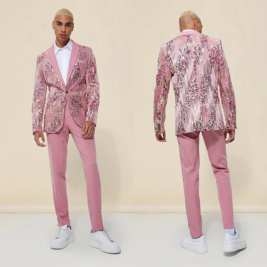 Traje de novio a medida con chaqueta y pantalón de lentejuelas rosas, elegante, para boda, 2 piezas