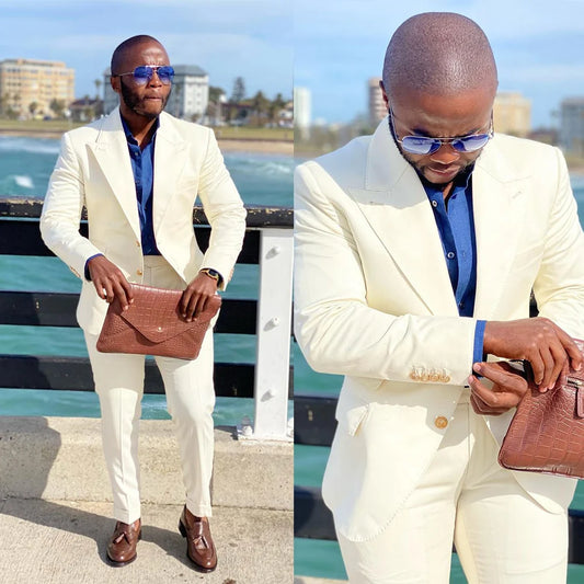 Traje de 2 piezas para hombre, color marfil, talla grande, esmoquin liso para novio, solapa de pico, blazer para fiesta de graduación (chaqueta + pantalón)