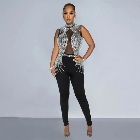 Monos de fiesta ajustados y sexis con malla transparente y retazos de diamantes para mujer, sin mangas, elegantes, con diamantes de imitación, para discoteca