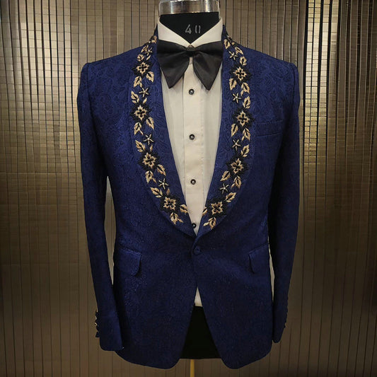 Trajes de hombre de tejido jacquard azul real con apliques para novio, esmoquin de boda, conjuntos de 2 piezas, chaquetas para cena y graduación, Terno Masculino Completo