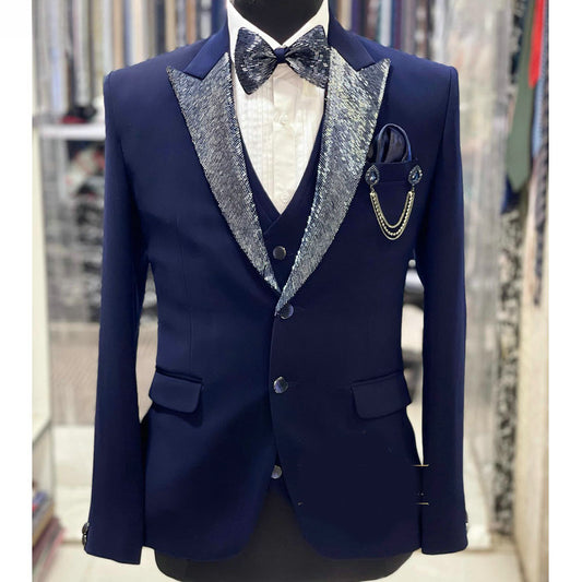 Traje de boda para hombre, de jacquard azul real, con abrigo y pantalón, traje formal de 3 piezas (chaqueta, pantalón y chaleco).