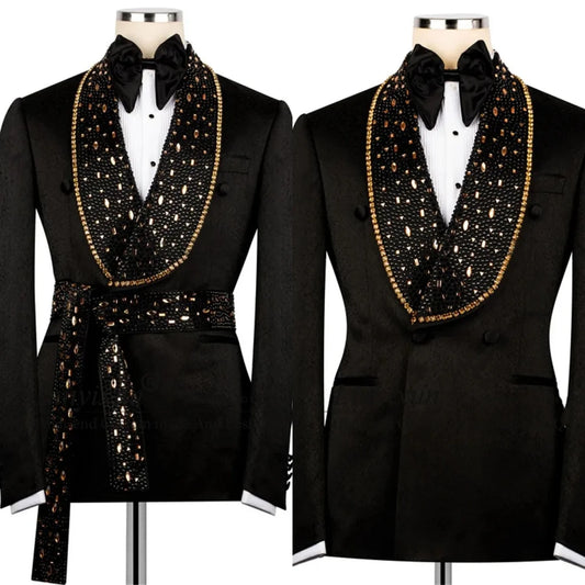 Crystal Men Wedding Suits Shawl Lapel Tuxedo Belt Groom Wear 2 Pcs Jacket Pants Business Evening Party Customized