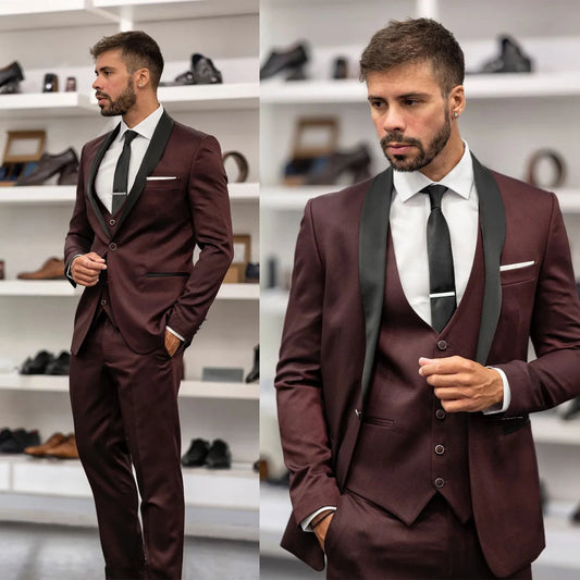 Trajes de hombre burdeos de corte entallado de 3 piezas para boda, esmoquin para novio, chaqueta, pantalón y chaleco.