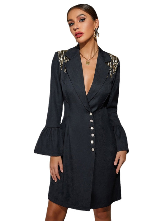Trajes de lujo con cristales para mujer, 1 pieza, blazer negro, escote en V profundo, manga larga, vestido de fiesta de graduación, minivestido de noche corto sexy