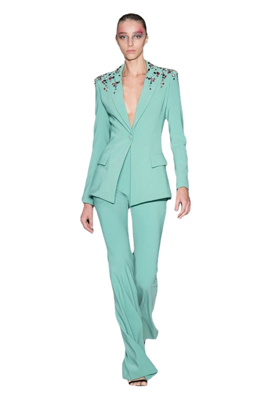 Conjunto de traje de diseñador verde para mujer, con apliques de cuentas de lujo, para boda, fiesta de noche, vestido de graduación, 2 piezas, blazer y pantalones, hecho a medida.