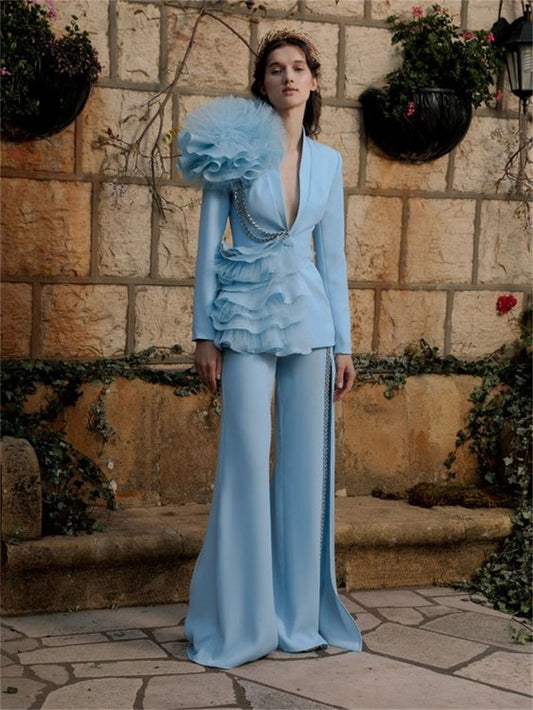 Conjunto de traje de 2 piezas con cristales de lujo para mujer, blazer con volantes de tul, pantalones anchos con abertura, vestido de fiesta de graduación hecho a medida.
