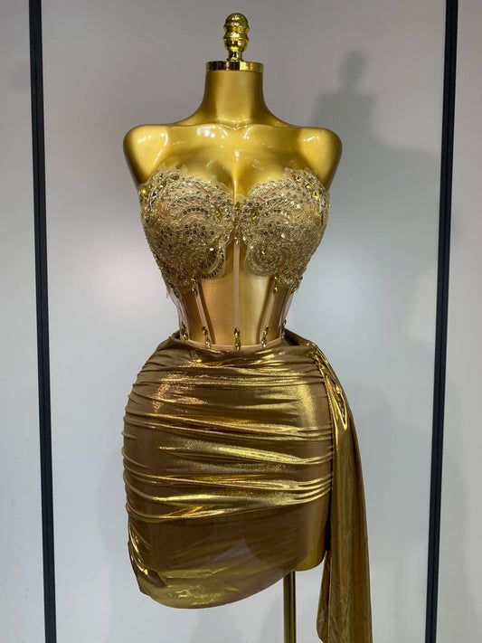 Women Sexy Strapless Sequins Rhinestone Gold Dress Glitter Top Two Pieces Sets Birthday Evening Party Club Singer Stage Outfit