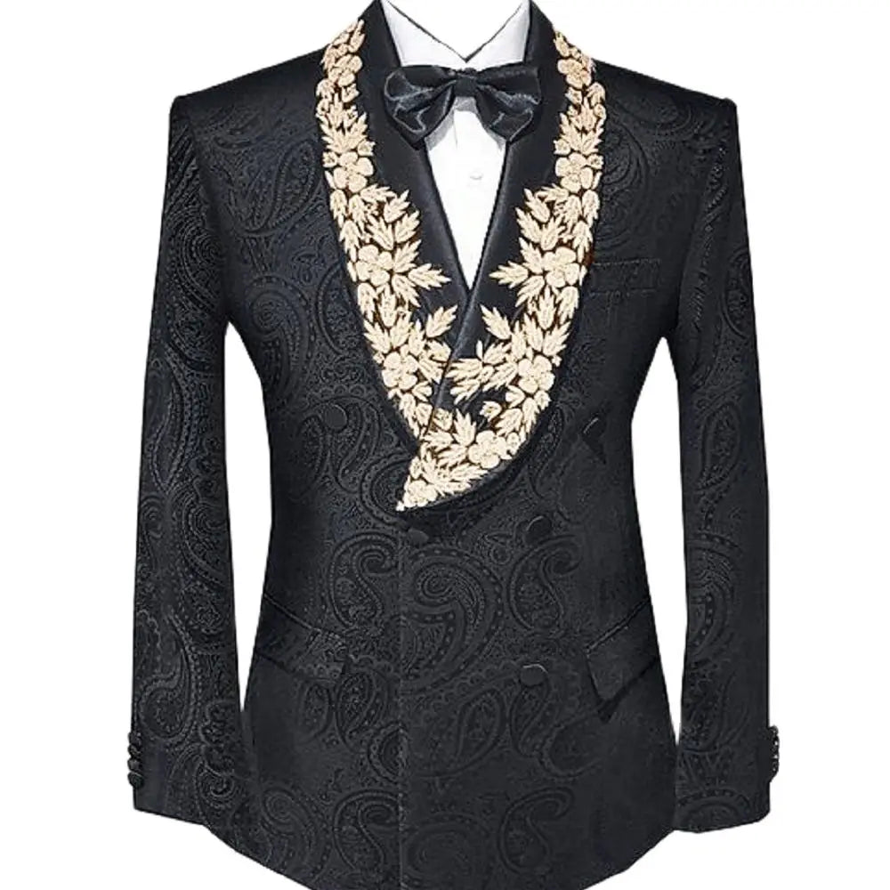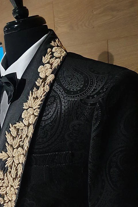 Haga una entrada triunfal con este lujoso traje para hombre, con un impactante diseño de apliques de encaje negro y dorado. Perfecto para bodas, graduaciones o eventos formales, este esmoquin luce una sofisticada solapa chal que le da un toque elegante a su conjunto. Confeccionado con meticulosa atención al detalle, este traje está hecho a medida para garantizar un ajuste perfecto, permitiéndole sentirse cómodo y seguro en su día especial. La combinación de materiales de alta calidad y elaborados detalles de encaje crea un look único que destaca entre la multitud. ¡Eleve su vestuario formal con este impresionante esmoquin que representa estilo y sofisticación!