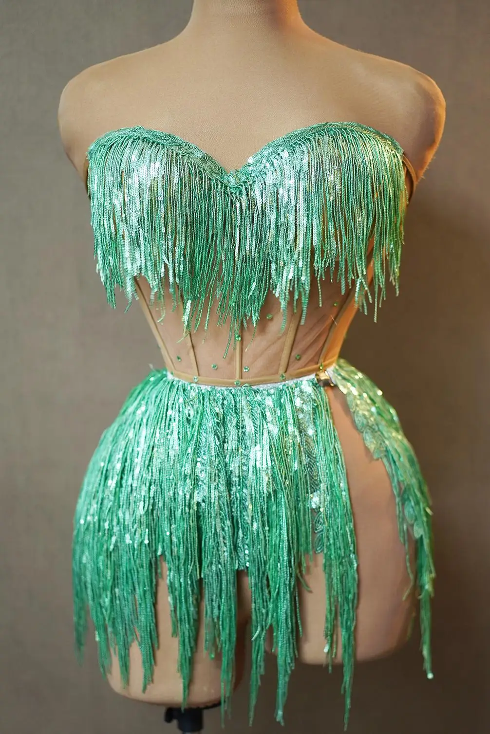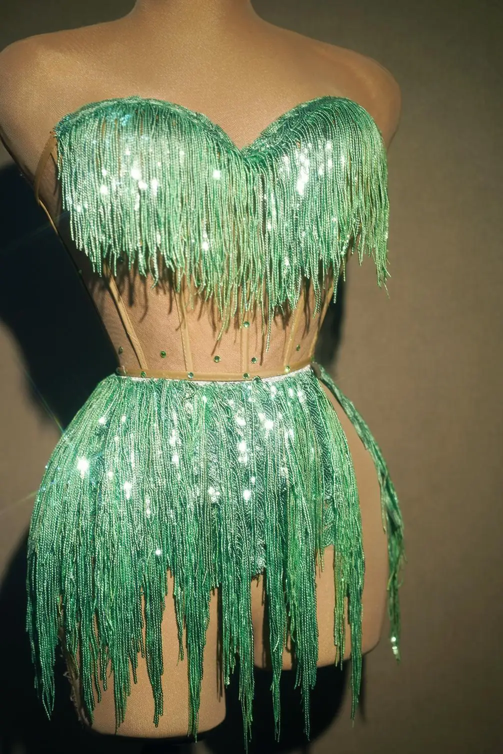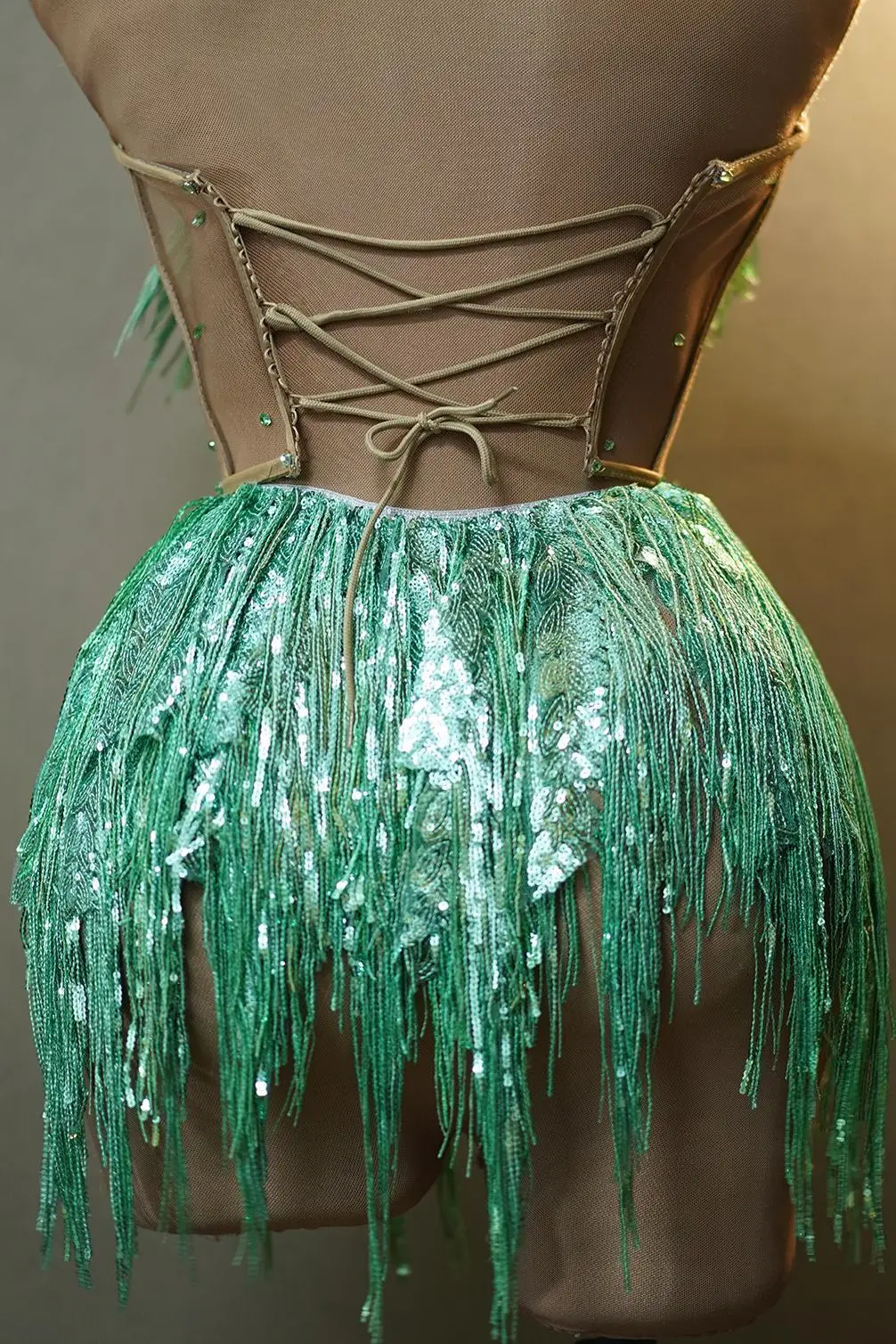 Glamuroso conjunto de disfraz con flecos de lentejuelas verdes para mujer: ropa de baile brillante con sujetador y falda corta para fiestas y actuaciones.