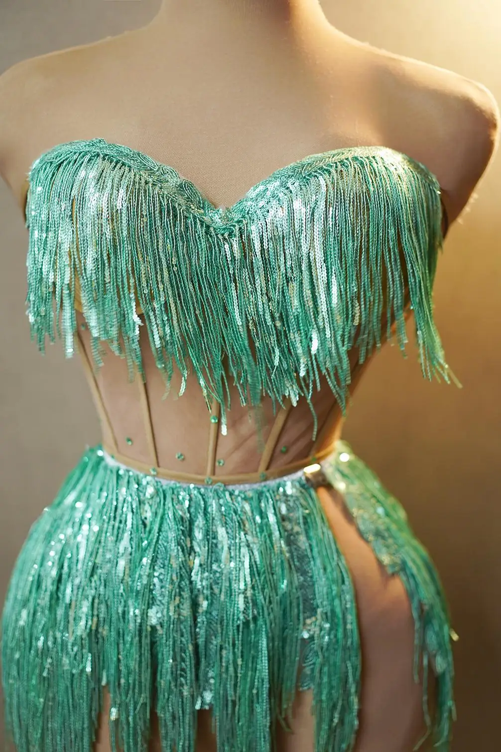 Conjunto de disfraz de tessel con lentejuelas verdes para mujer, ropa de baile de escenario brillante, sujetador de fiesta sexy con borlas brillantes, vestido de pole dance, conjunto corto Xiaocao