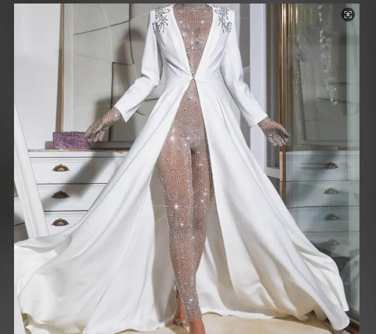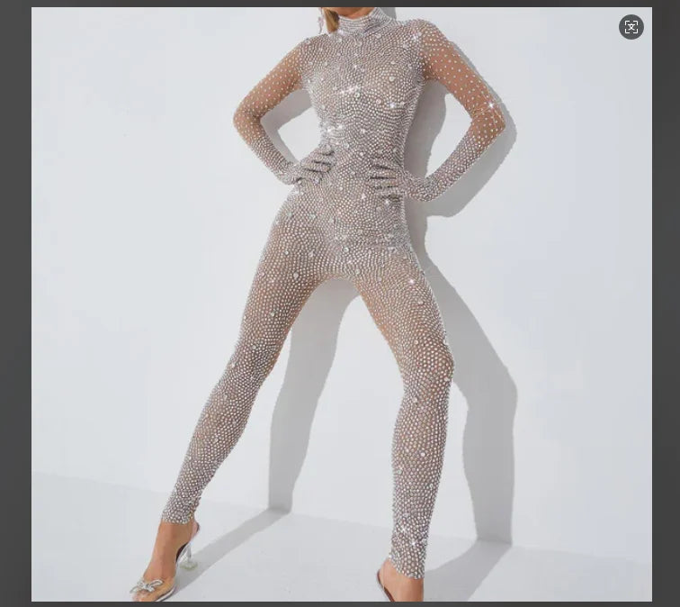 Shine on any stage or special occasion with this luxurious silver rhinestone mesh jumpsuit for women. Designed to dazzle, this statement piece features sparkling rhinestones over sheer mesh, creating a glamorous and bold look perfect for singers, dancers, and performers. Ideal for birthday parties and stage shows, this standout outfit ensures you’ll captivate every audience with your confidence and style.