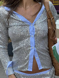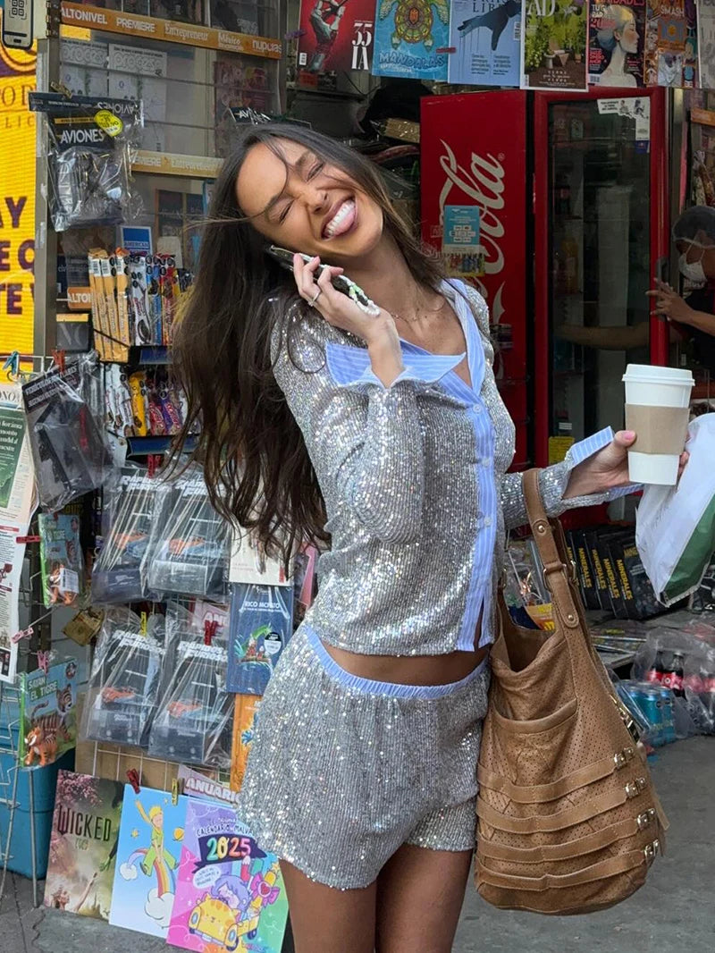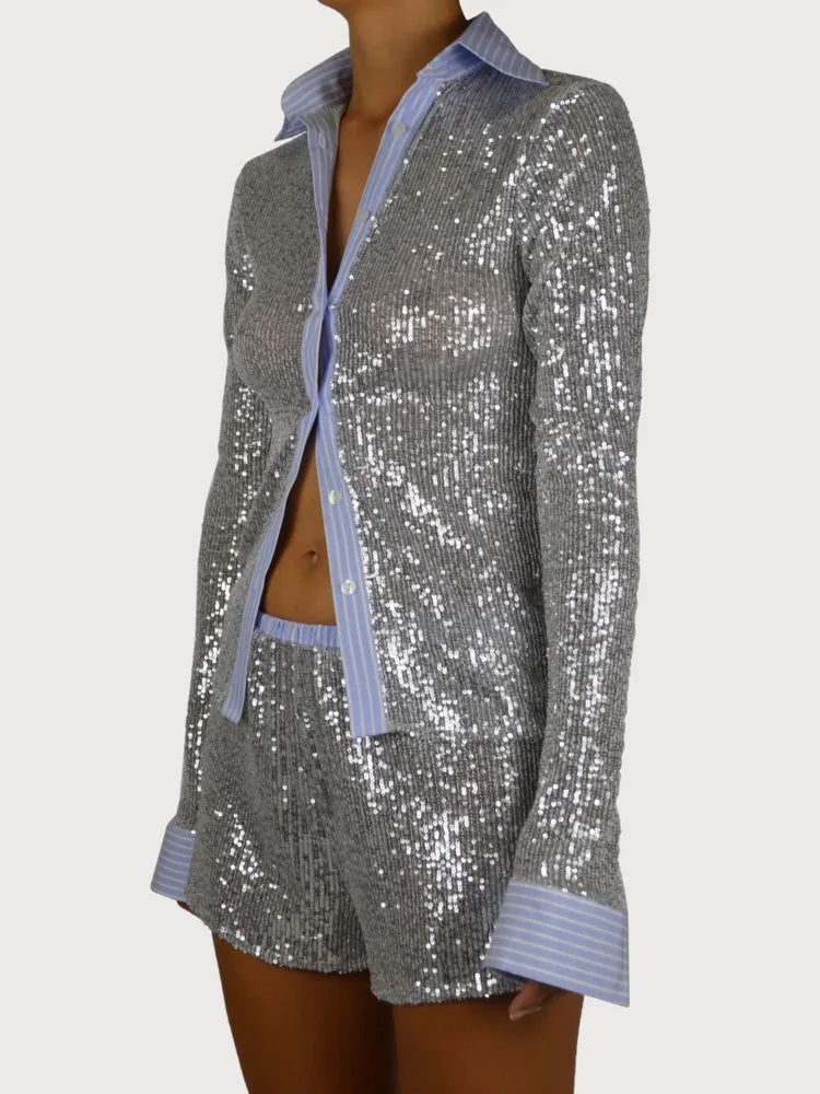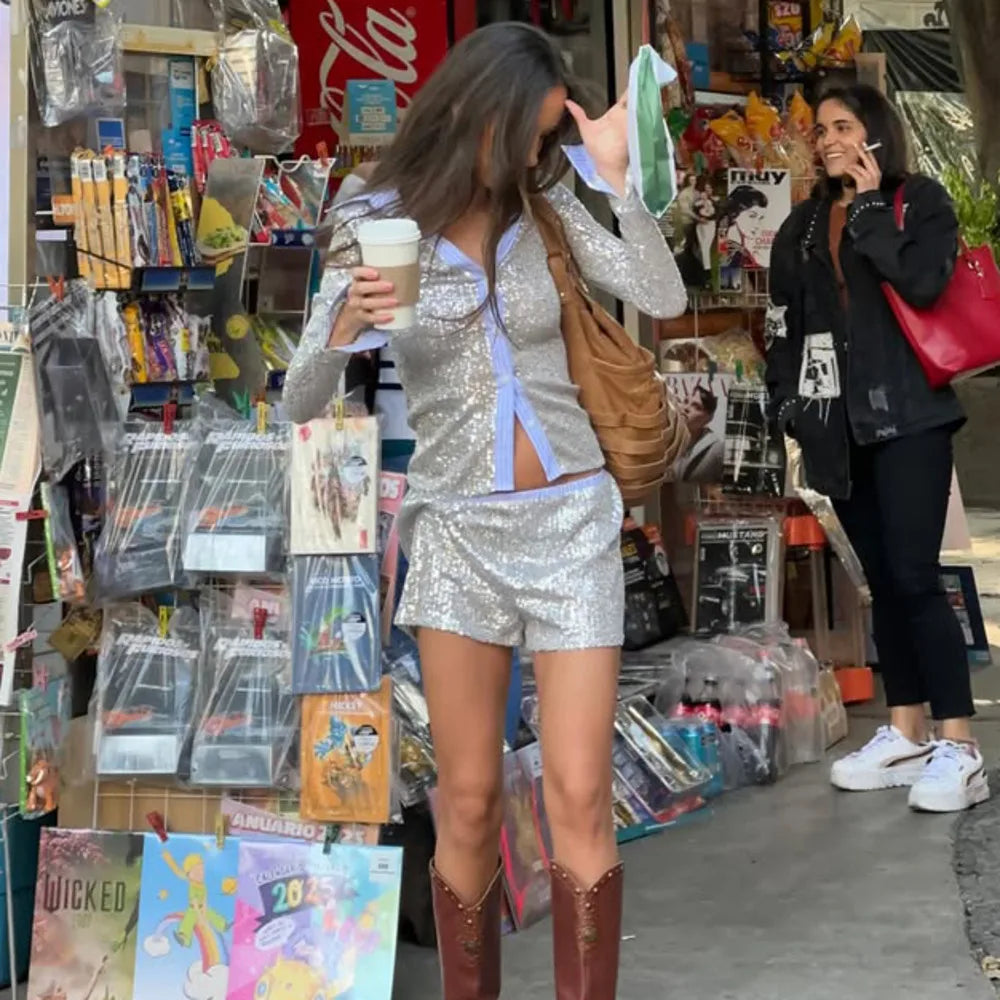 Step out in style with this Fashion Women’s Set featuring a long-sleeved shirt paired with dazzling sequined shorts. Designed with chic patchwork details and a slim fit, this two-piece ensemble boasts a modern, perspective (semi-sheer) look for an added touch of sexiness. Perfect for streetwear, parties, or a bold night out, this outfit highlights your figure and ensures you stand out with confident, fashion-forward flair.