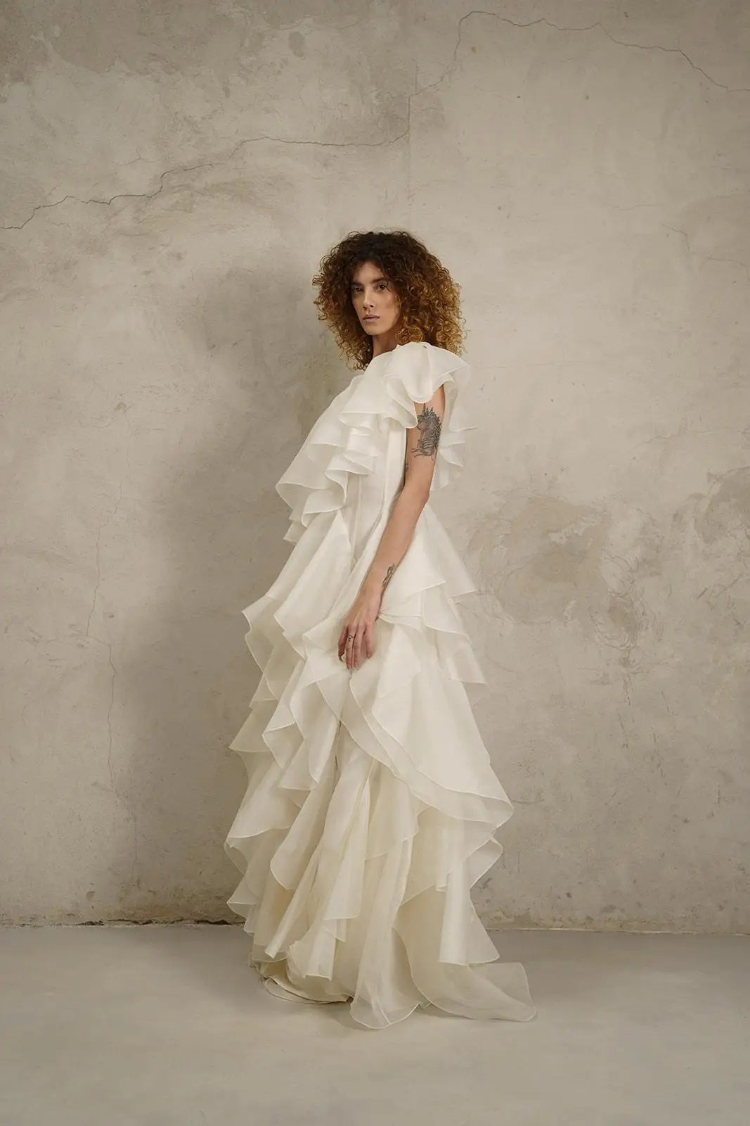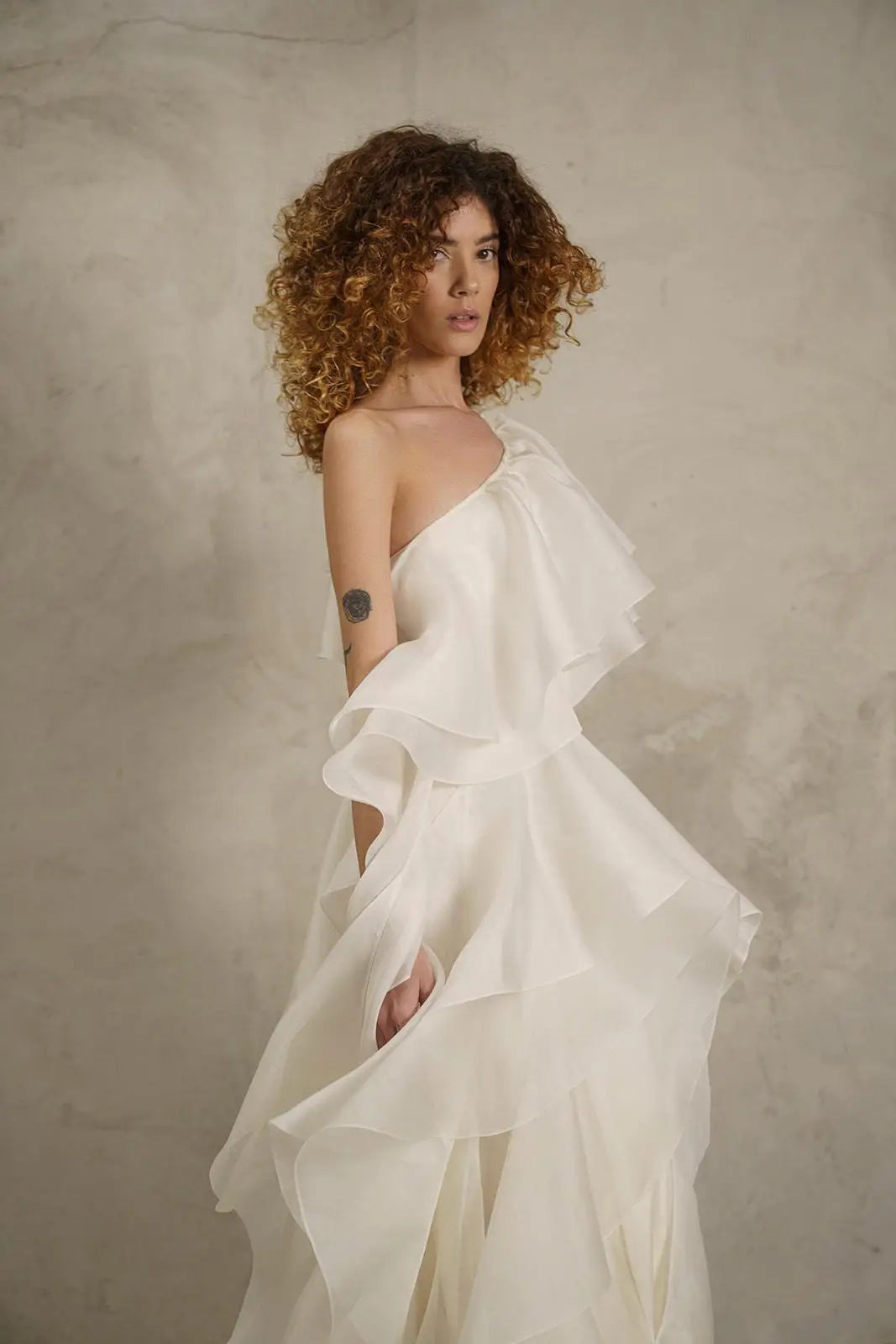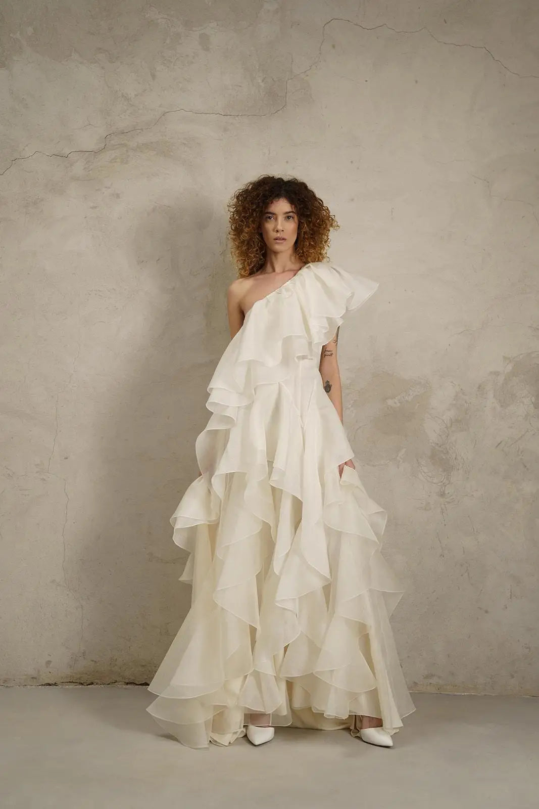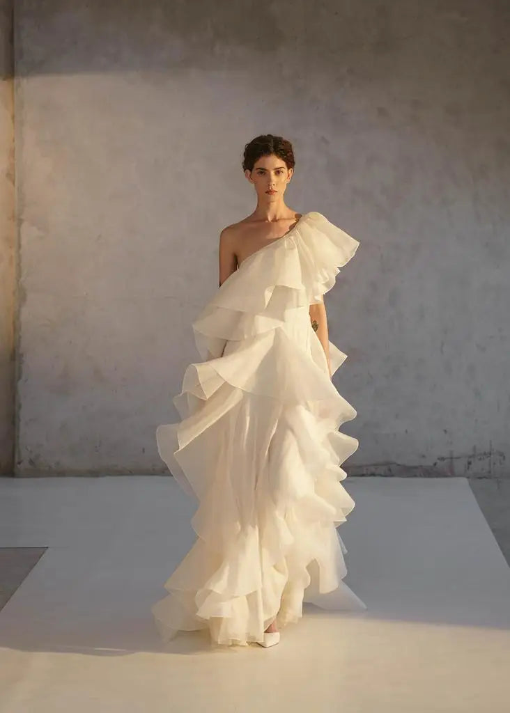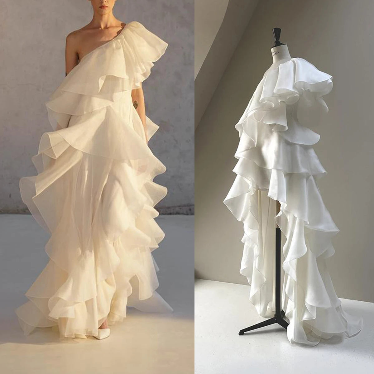 Elegante vestido de noche asimétrico de un solo hombro con volantes y cola larga para ocasiones especiales y fiestas.