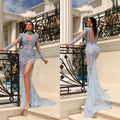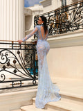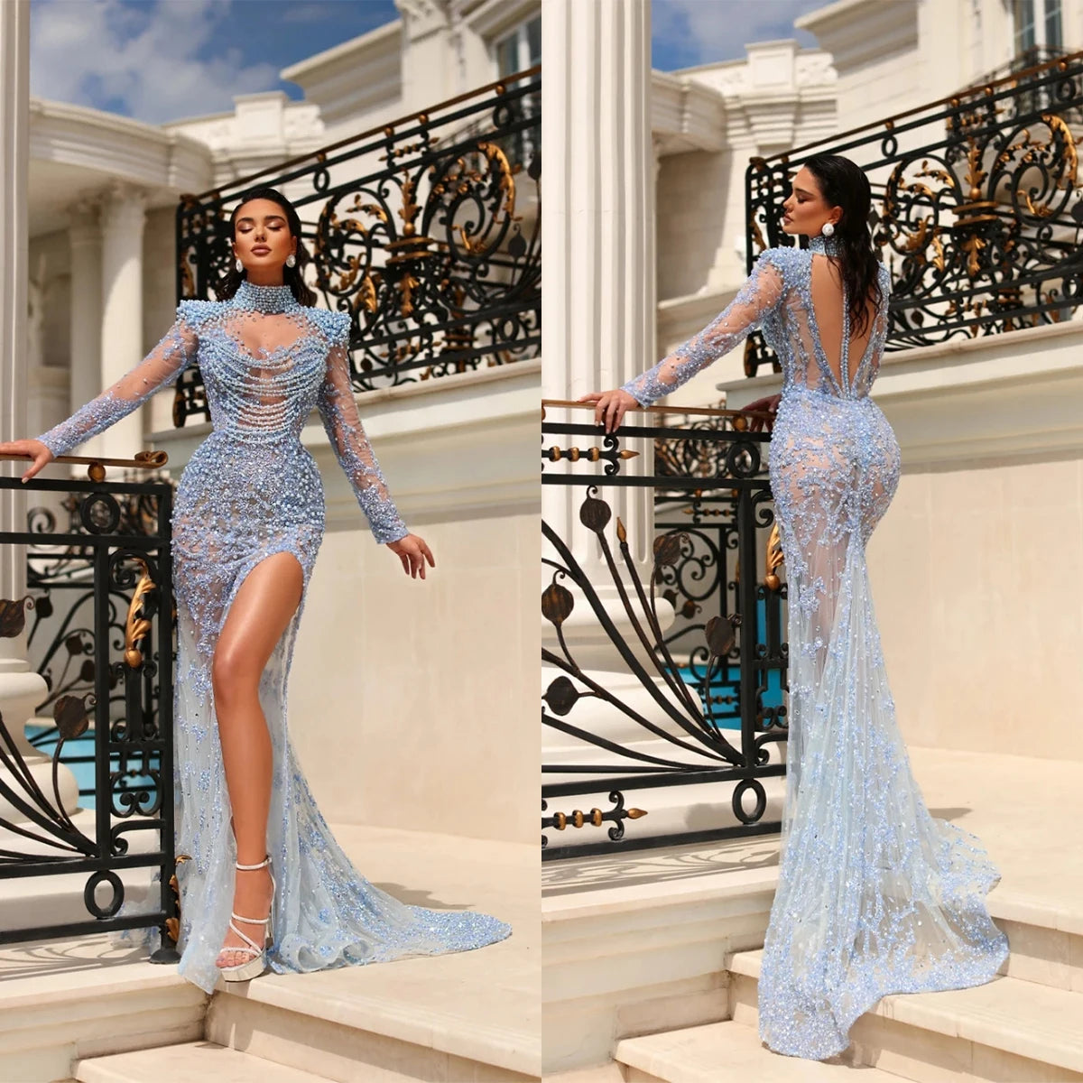 Elegante vestido de noche azul cielo de cuello alto con cuentas, corte A, abertura y cola larga para ocasiones formales.