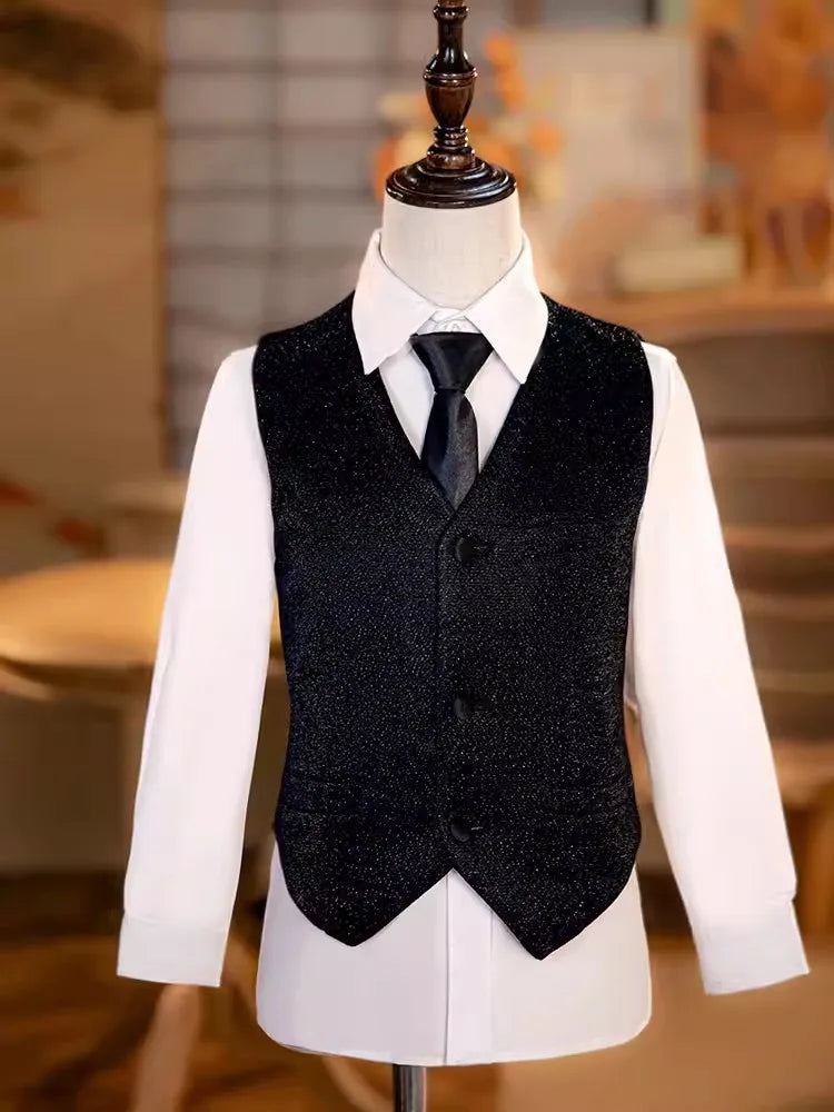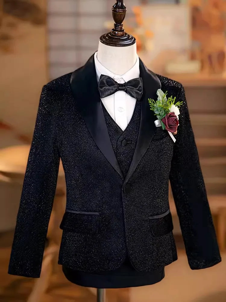 Presentamos nuestro traje de fotografía de presentador con chaqueta negra brillante, chaleco y pantalón para niño, un lujoso traje de actuación diseñado para jóvenes caballeros. Este elegante conjunto de 3 piezas incluye una elegante chaqueta negra, un elegante chaleco y pantalones a medida, perfecto para bodas, presentaciones y ocasiones especiales. La tela brillante le da un toque sofisticado, asegurando que su hijo luzca elegante y distinguido. Diseñado para brindar comodidad y estilo, este vestido de esmoquin es la opción ideal para cualquier evento donde su pequeño necesite brillar. Realce su vestuario con este exquisito traje que combina la elegancia clásica con un toque moderno.