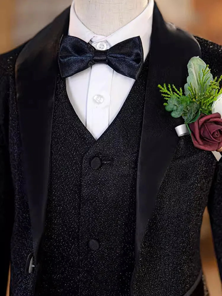 Elegante traje de esmoquin negro brillante con pajarita para niño: perfecto para bodas, fiestas y sesiones de fotos.
