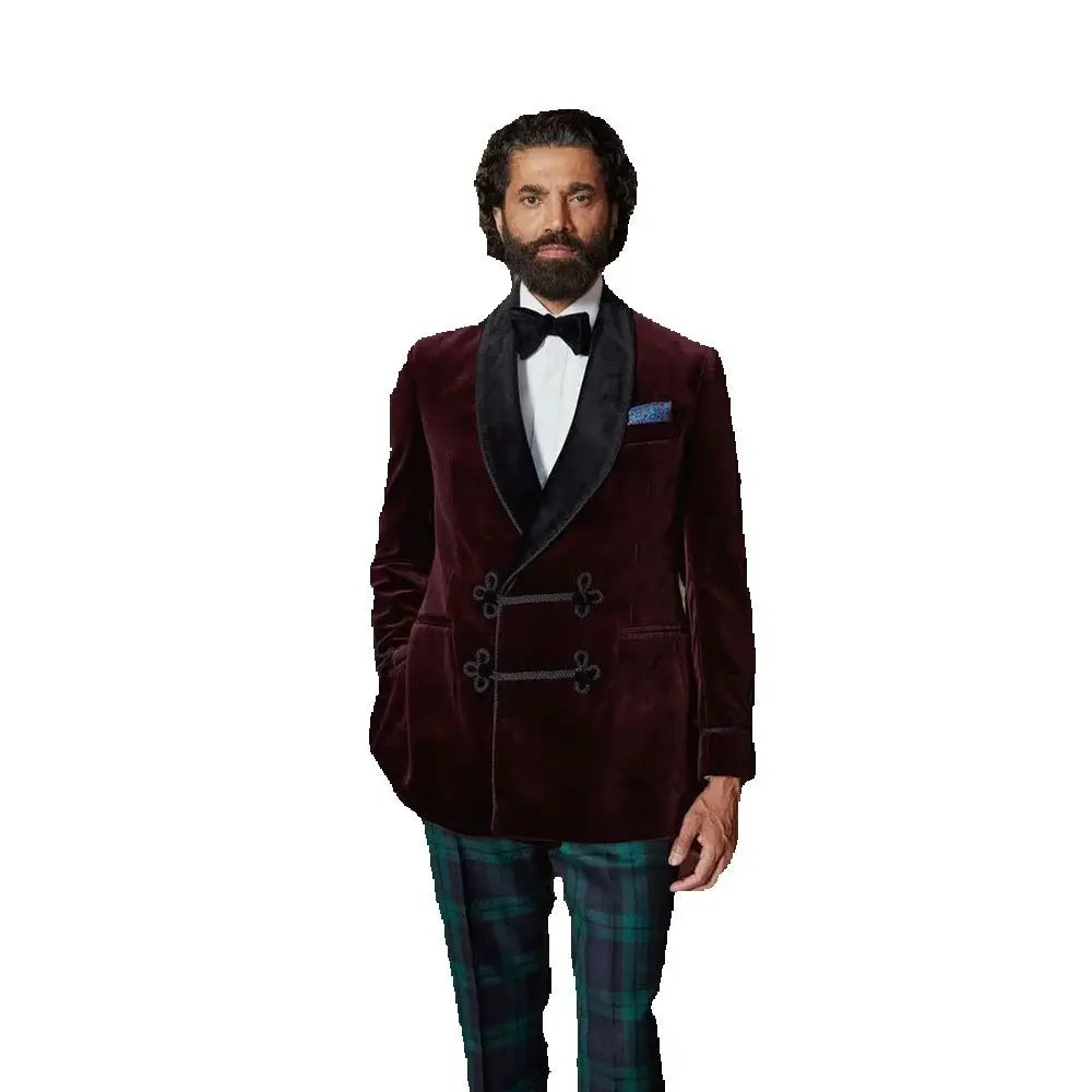 Casual Smoking Men's Suits 2 Piece Jacket Pants Velvet Shawl Lapel Skinny Male Clothing Customized Costume Homme Blazer
