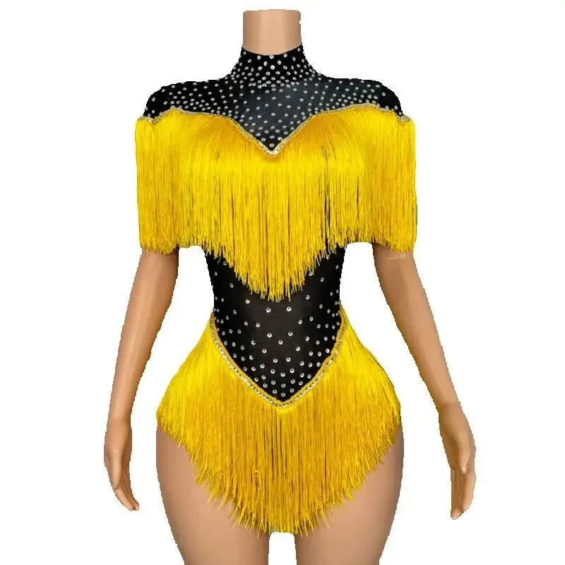 Luce un estilo impactante en el escenario o en la discoteca con este impresionante body amarillo con flecos, diseñado con deslumbrantes pedrería para un brillo máximo. Perfecto para drag queens, gogós y cualquiera que quiera iluminar la noche, este sexy disfraz presenta divertidos detalles de flecos y un ajuste ceñido. Ideal para discotecas, fiestas de DJ, raves y actuaciones inolvidables, es el atuendo perfecto para las mujeres que quieren ser el centro de atención y bailar toda la noche.