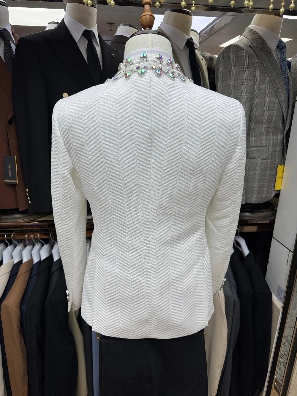 Shine with quiet sophistication in this Elegant Men’s 3‑Piece Suit — a tailor‑made ensemble featuring a refined shawl lapel one‑button jacket, coordinating jacquard or plain vest, and perfectly cut trousers. Hand‑applied crystals and delicate beading add couture sparkle without sacrificing classic tailoring, making this set ideal for grooms, red‑carpet events, proms, and upscale evening occasions.