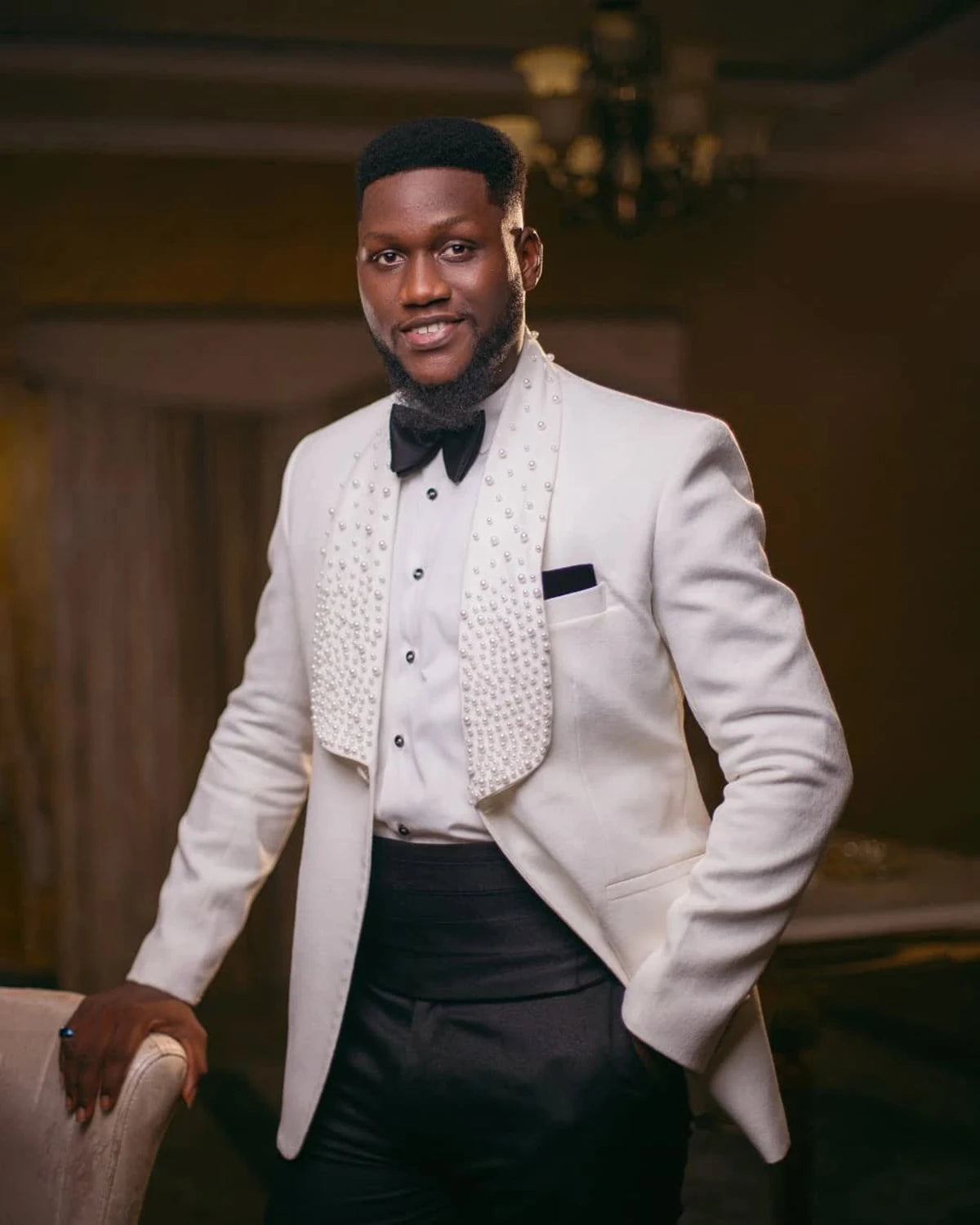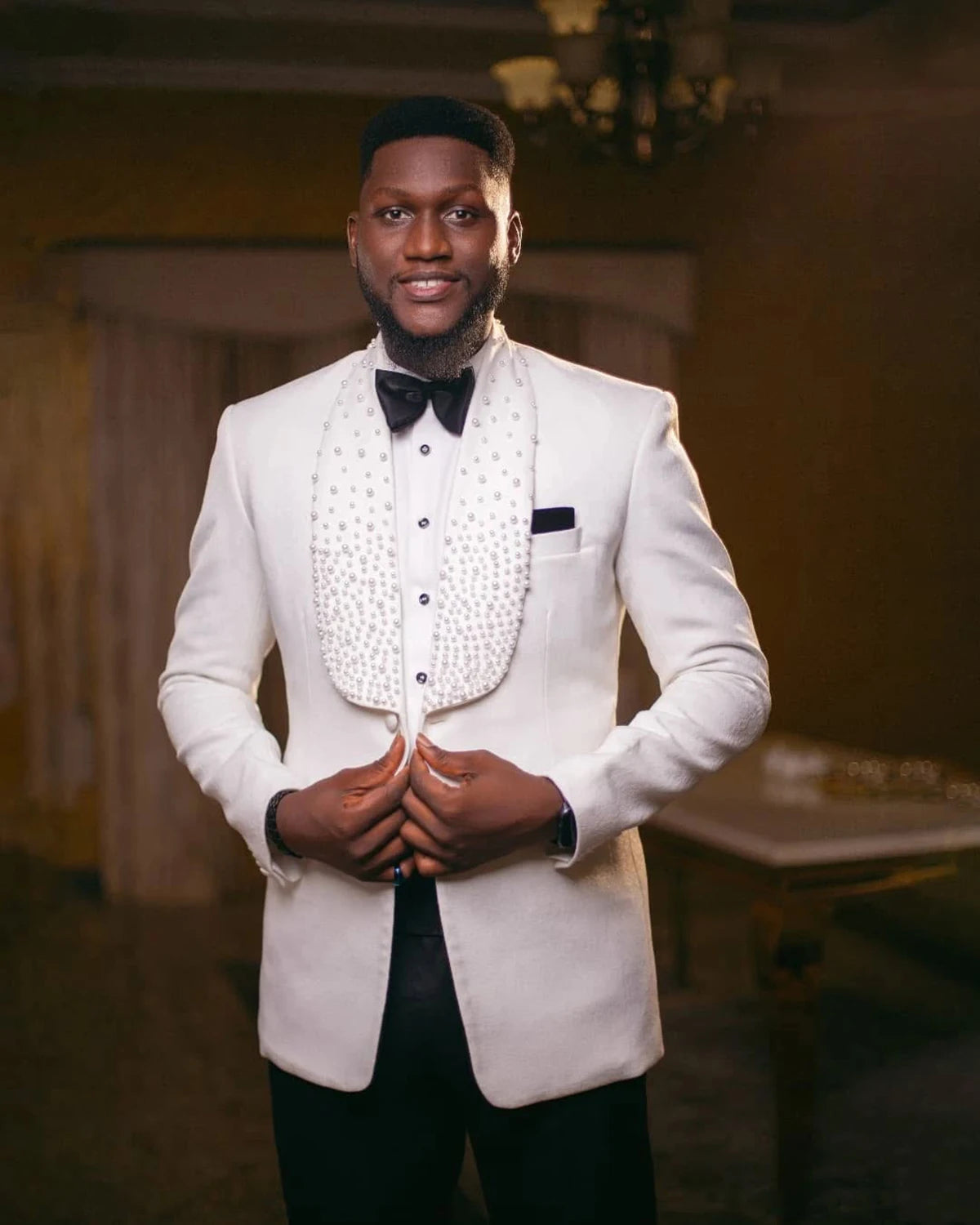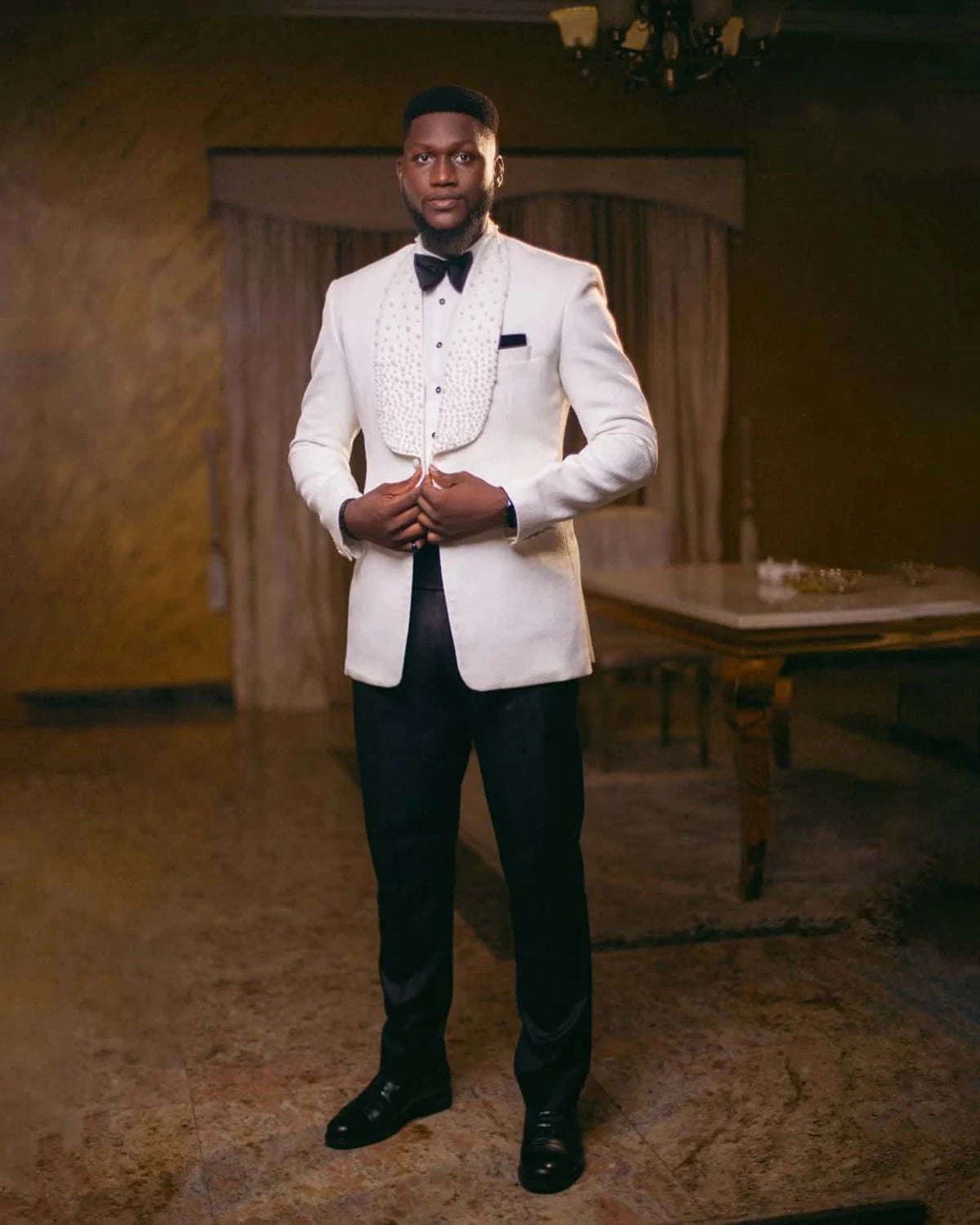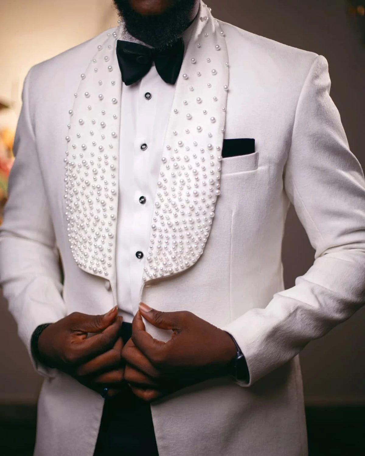 Make every entrance unforgettable with this Elegant Men Suits two-piece ensemble, expertly tailored for grooms, groomsmen, and style-conscious guests attending evening parties, weddings, or formal events. Combining timeless tailoring with refined decorative detail, this set features a shawl lapel jacket finished with delicate pearl embellishments, paired with impeccably cut matching pants.