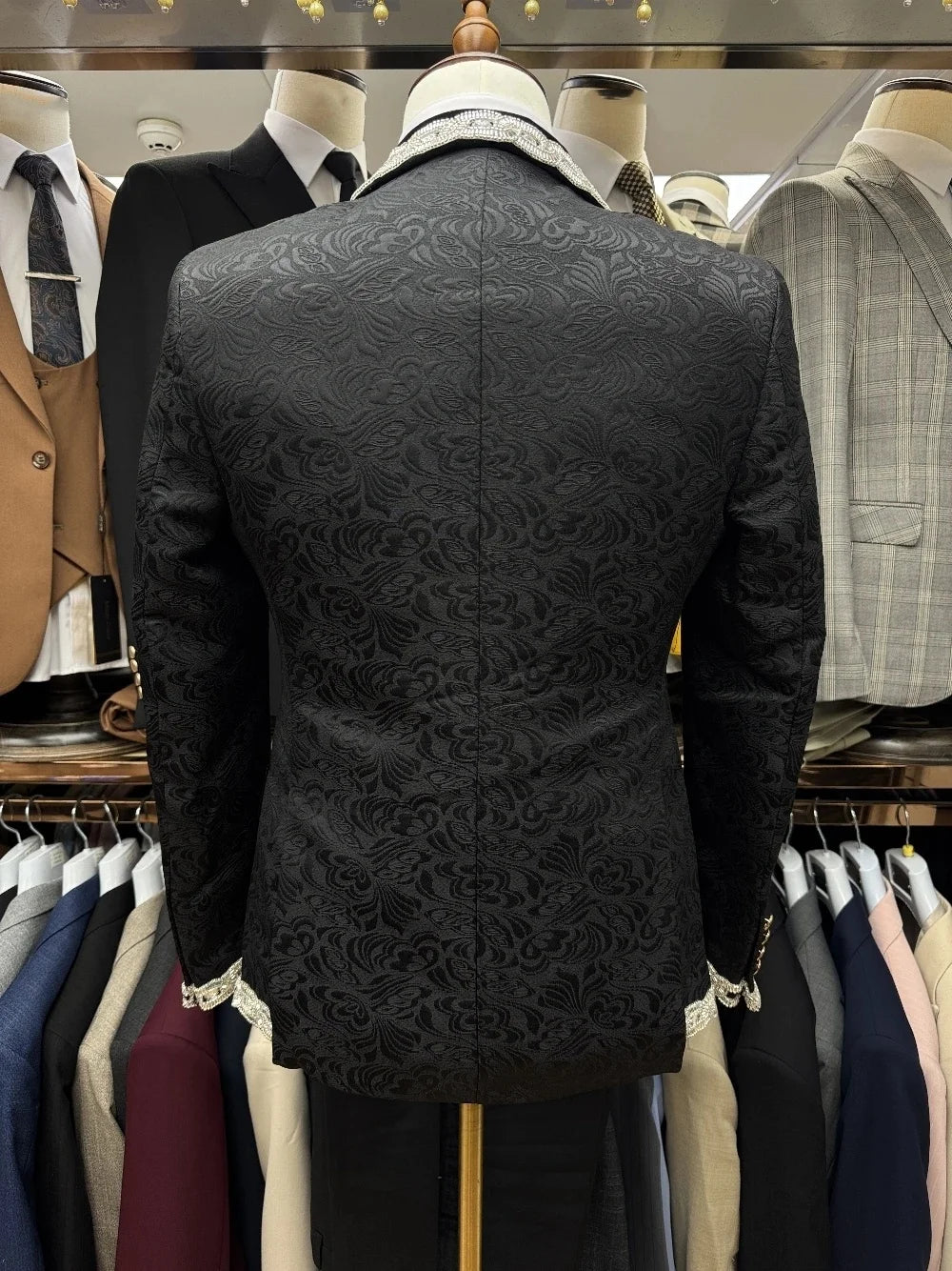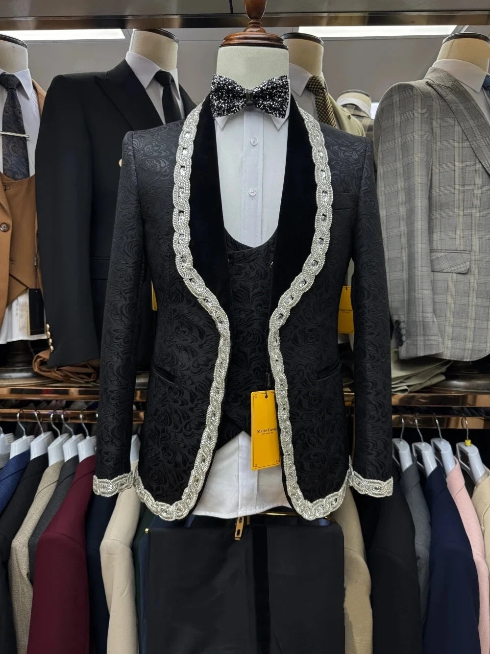 Present a refined, unforgettable wedding-day look with this Elegant Men’s 3-piece suit—tailor-made to your measurements and crafted from luxurious jacquard fabric, featuring a graceful shawl lapel, one-button blazer, coordinated vest, and tailored trousers. Thoughtfully embellished with hand-applied beading, this set balances sophisticated texture with subtle sparkle for a timeless yet modern aesthetic suited to grooms, fathers of the groom, or anyone seeking elevated formalwear.